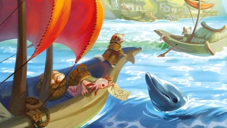The Everdell world will continue to grow in 2024. With Farshore – A Game in the World of Everdell, an independent connoisseur game is now appearing for the first time. Using their maritime animal species, which can also be combined with Everdell, players collect resources to build their own city. If you also manage to attract the right creatures at the right time, you can also move your own sailing boat and explore the rough coast. The goal in the game by Clarissa & James A. Wilson is to collect the most points using cards, shells, the sailboat and treasure chests.